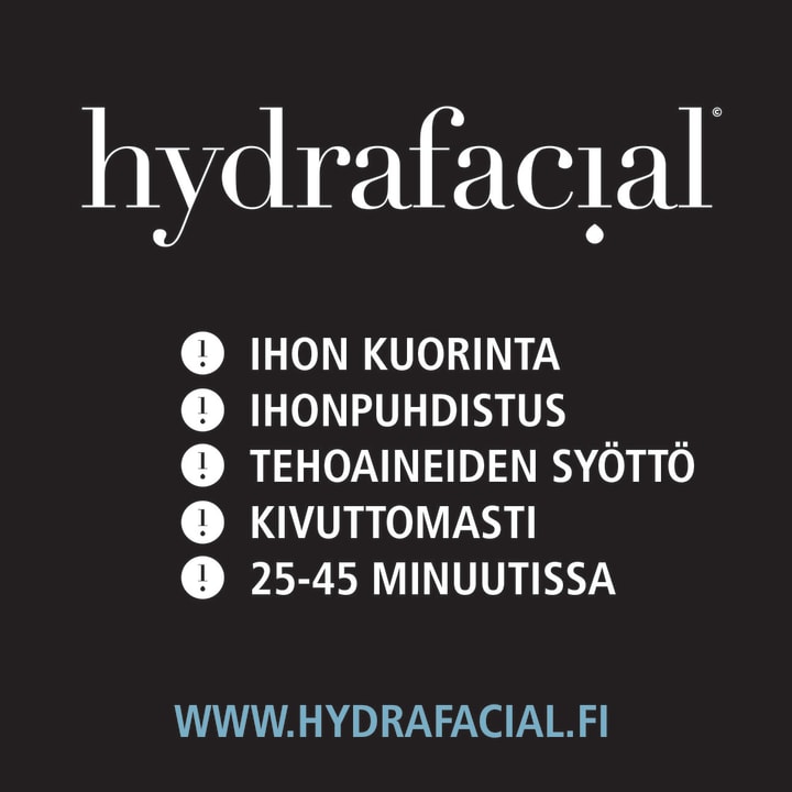 Hydrafacial on ihonhoitomaailmaa mullistava, markkinoiden edistynein ihonhoitoteknologia, jossa iho puhdistetaan, kuoritaan, ihohuokoset tyhjennetään ja tehoaineet syötetään ihoon kivuttomasti.